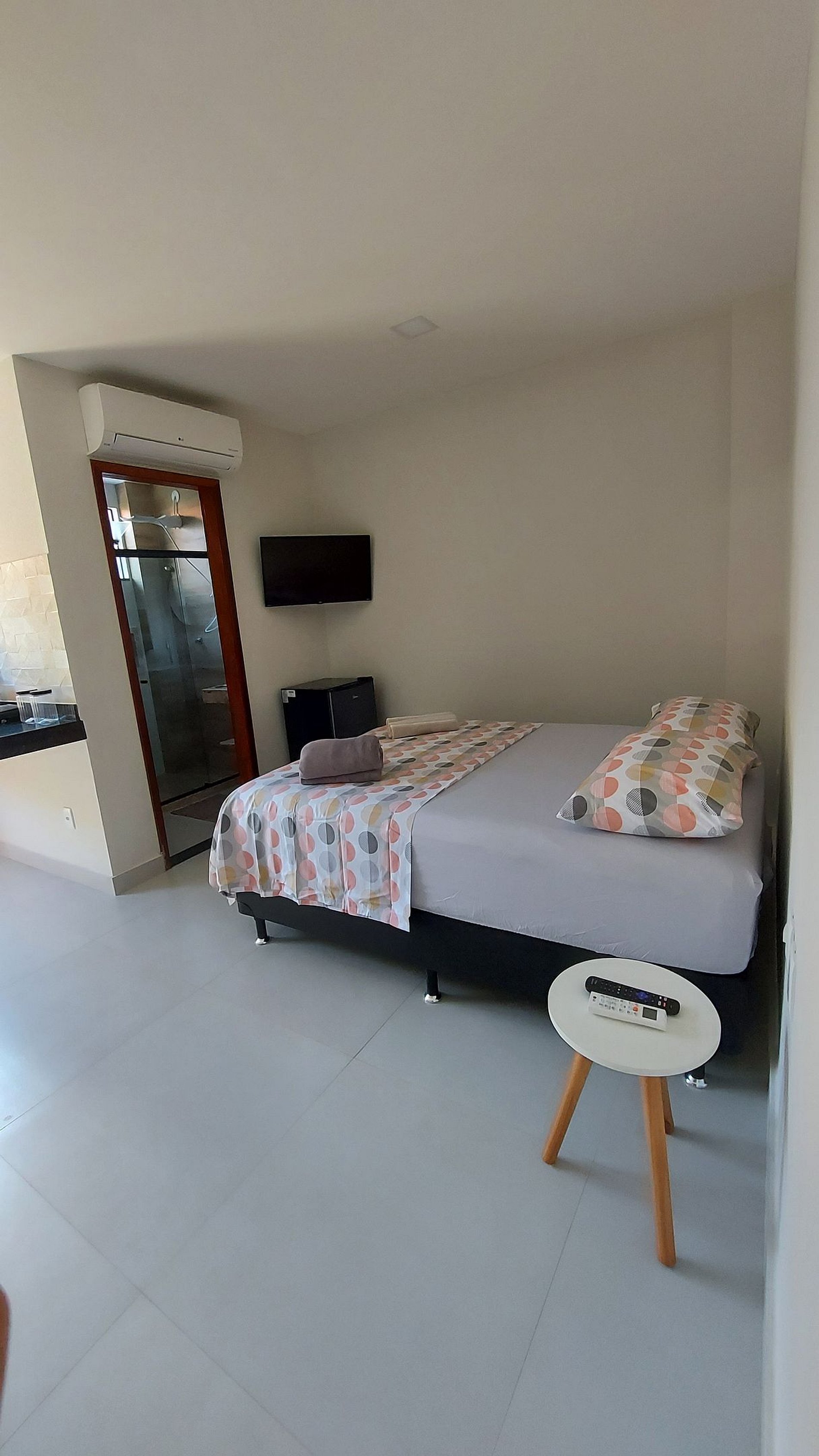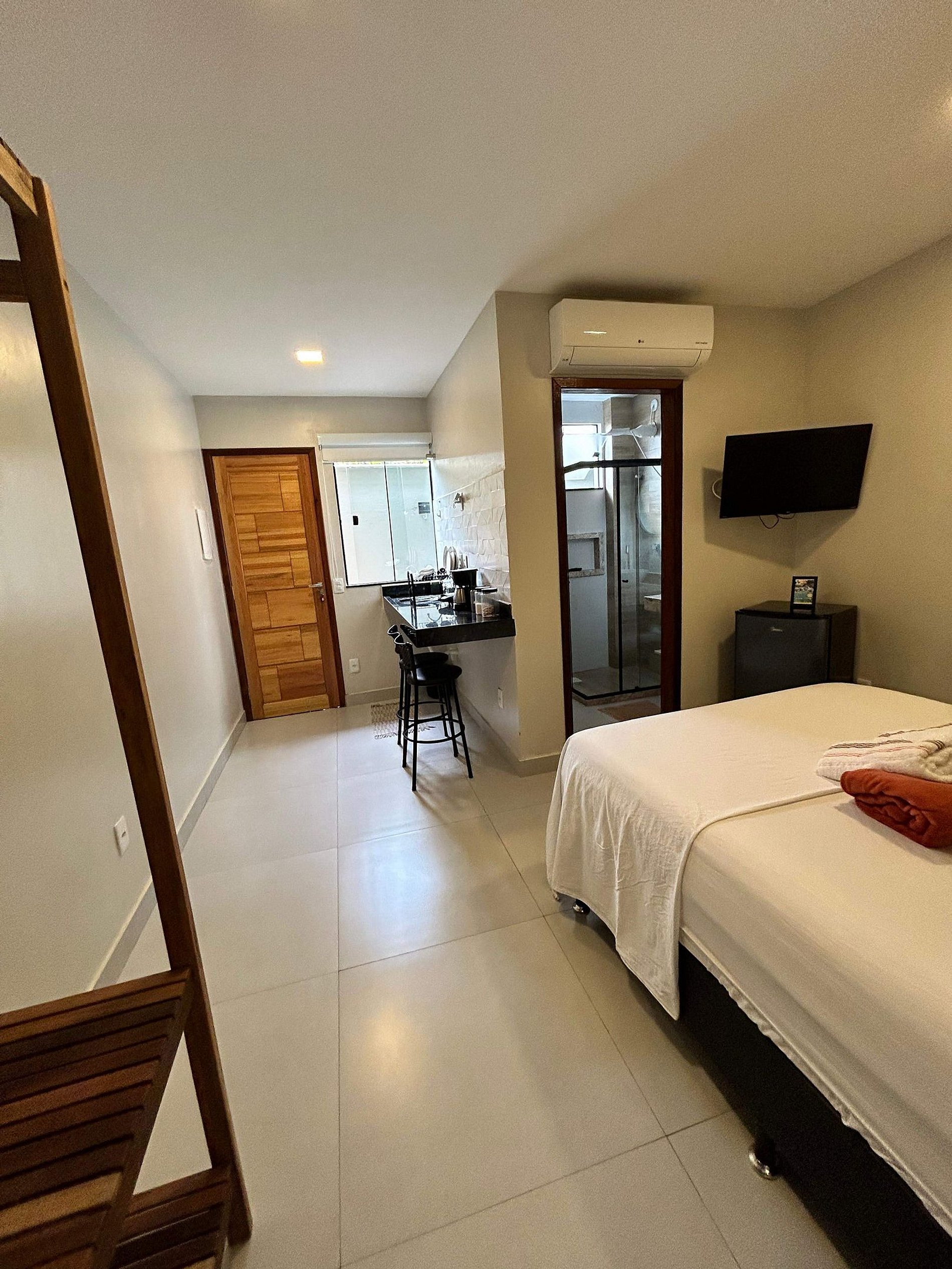 Suítes privativas, amplas, funcionais e modernas, equipadas com ar condicionado, frigobar, smartv, uma bancada com pia e acessórios para realização de cafés e lanches.