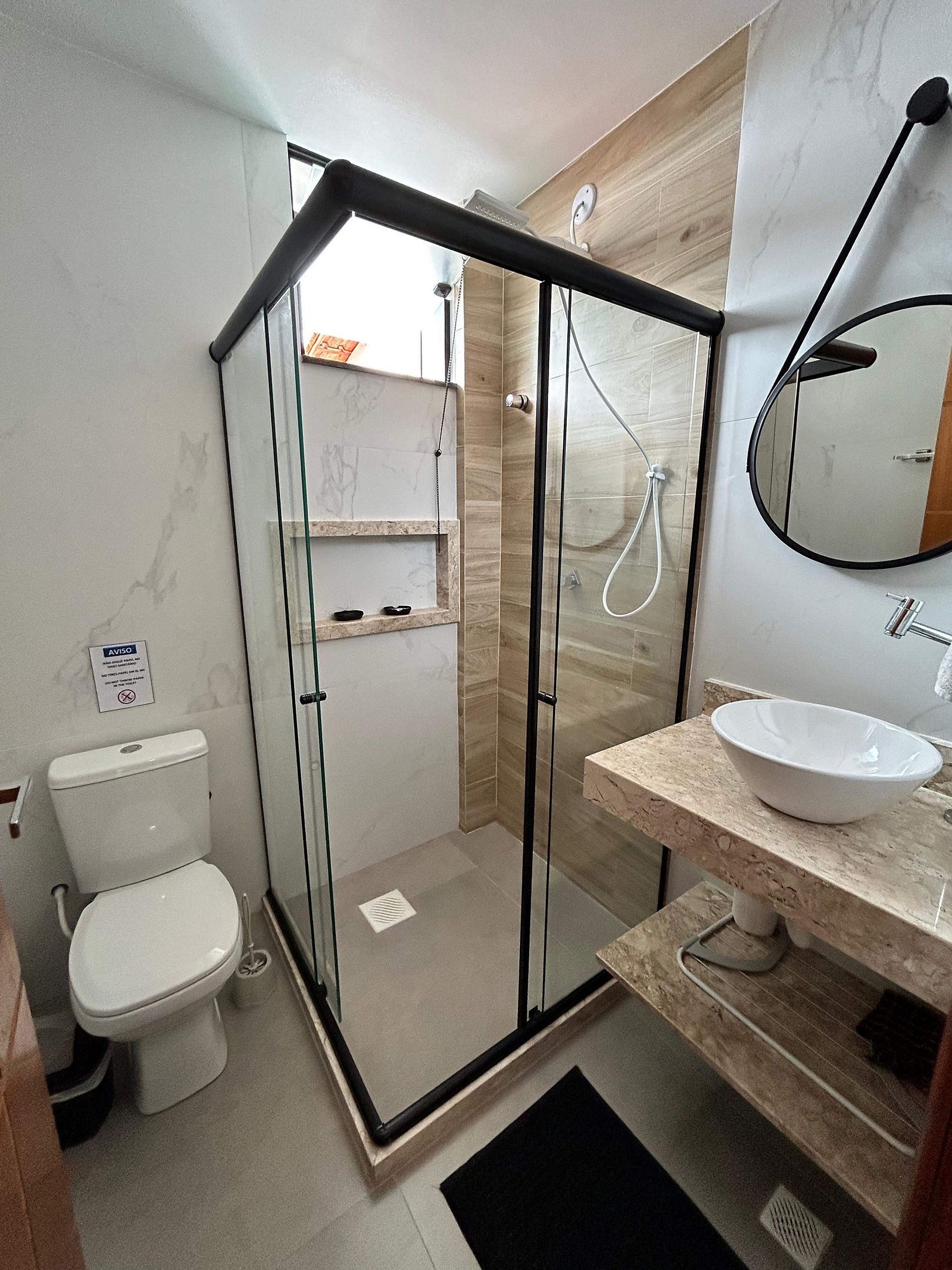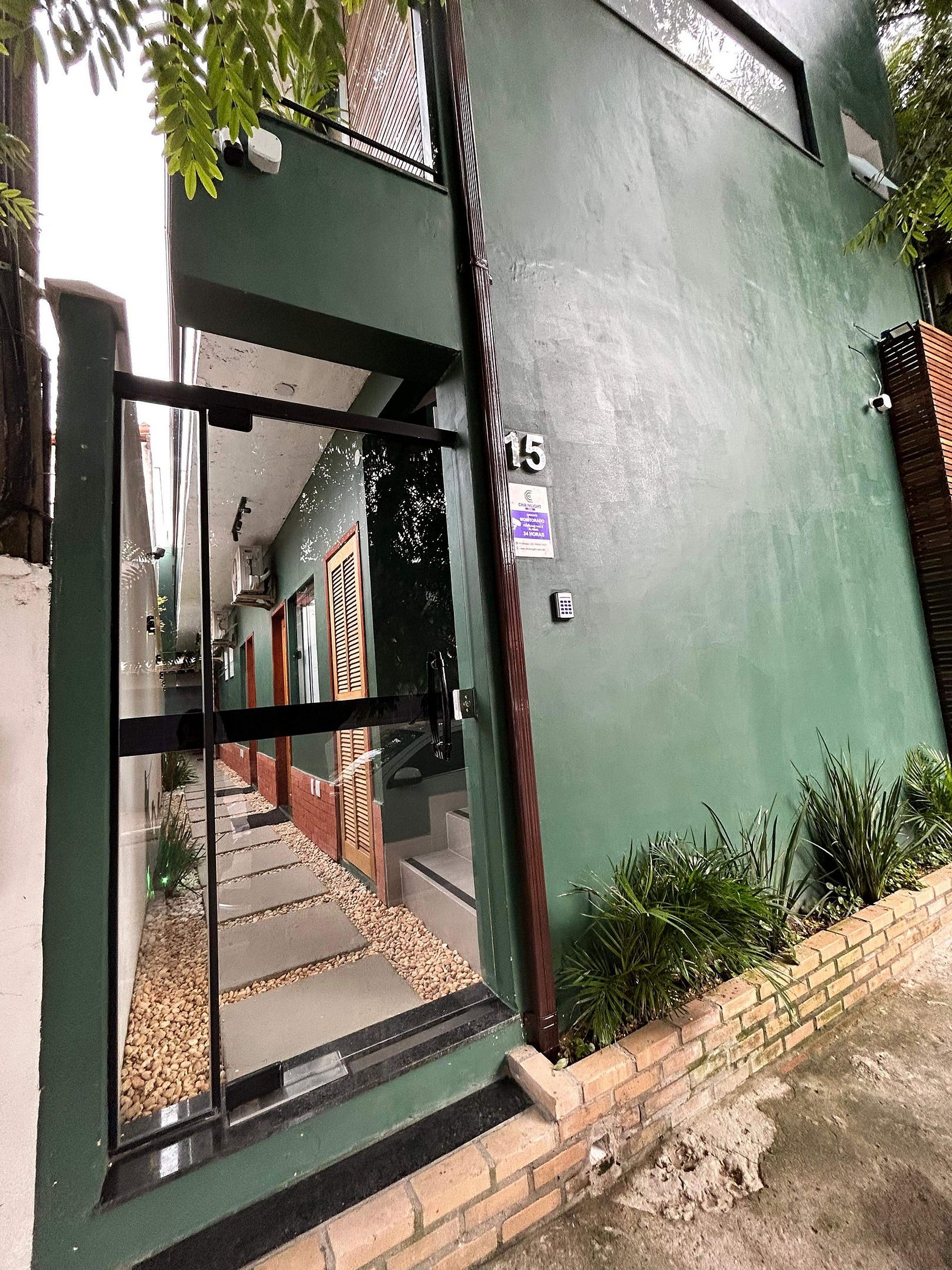O portão de entrada da hospedagem possui fechadura eletrônica por senha, sendo possível o check-in facilitado sem interação com o anfitrião ou, sendo combinado com antecedência, o encontro para entrega das chaves do quarto.