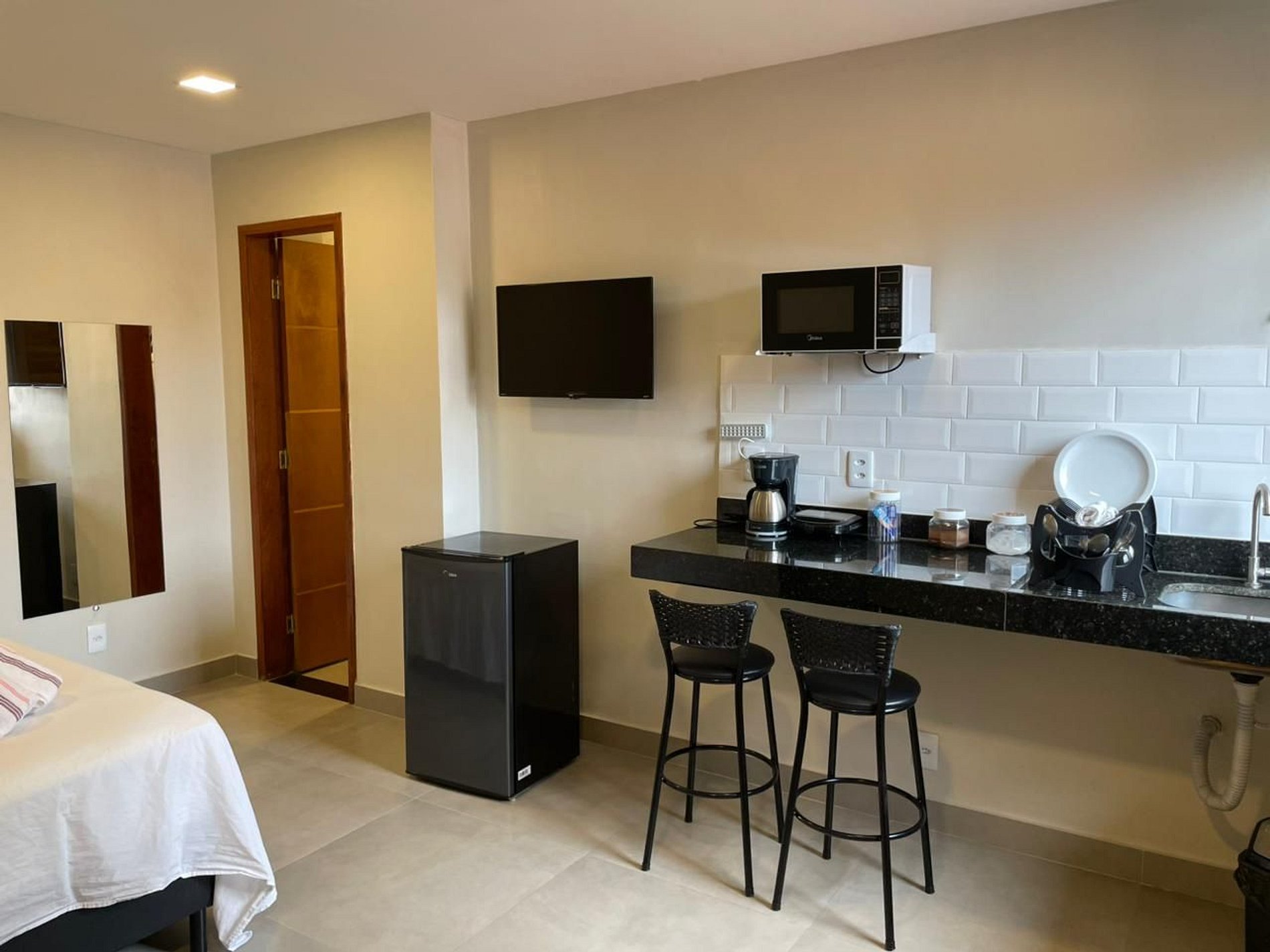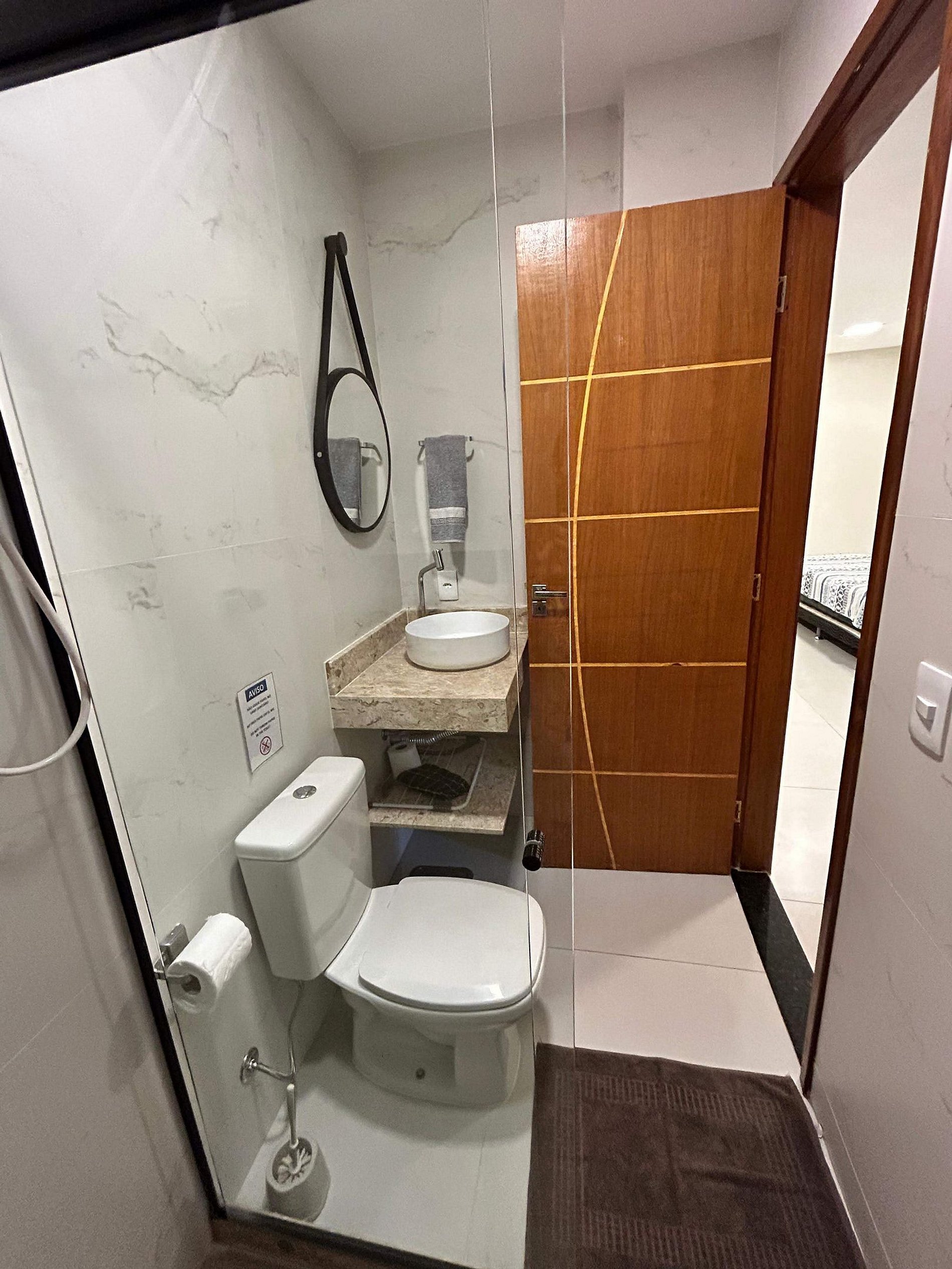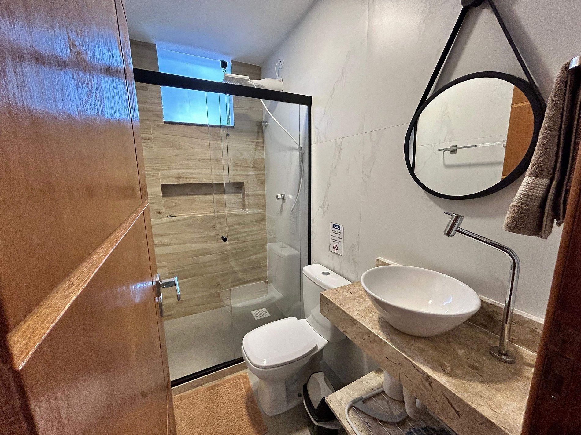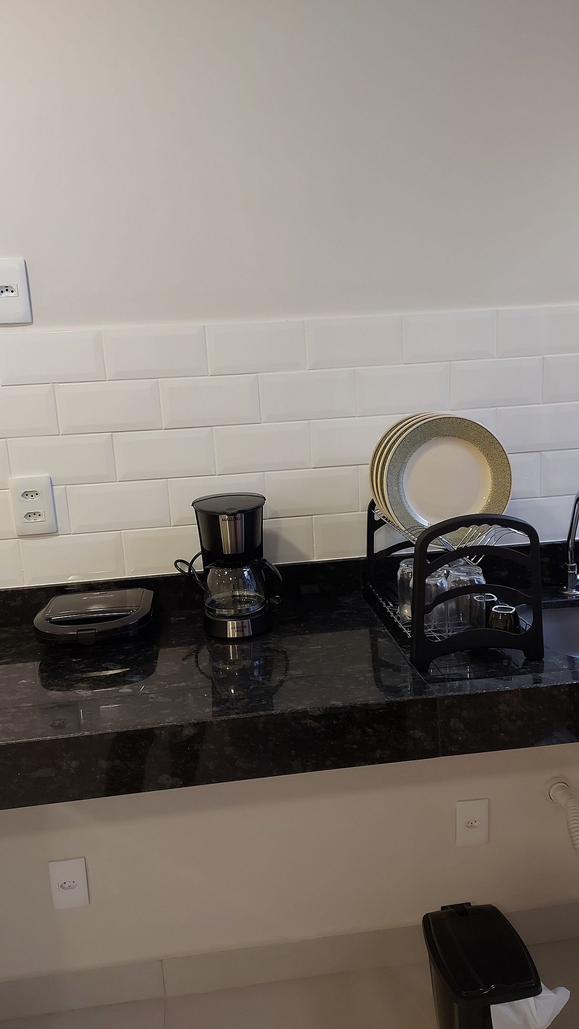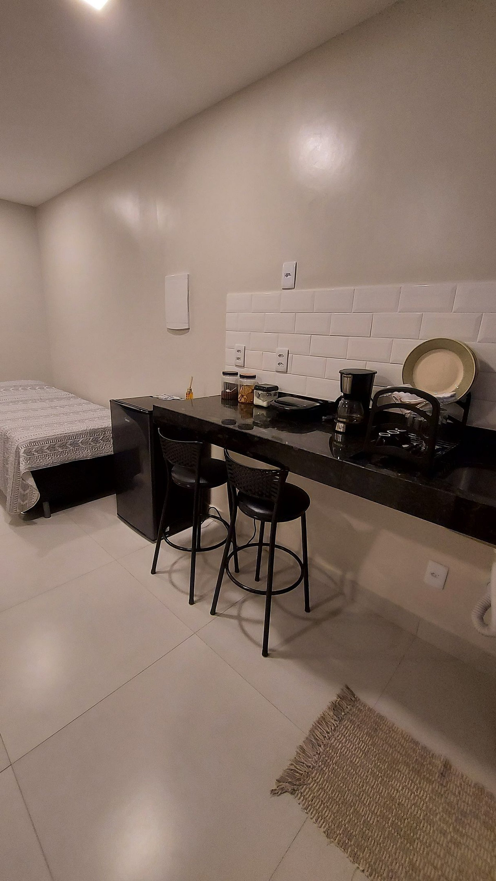 Suítes privativas, amplas, funcionais e modernas, equipadas com ar condicionado, frigobar, smartv, uma bancada com pia e acessórios para realização de cafés e lanches.